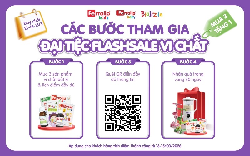 Từ ngày 13/03/2026 – 15/03/2026, khi mua và tích điểm thành công 03 sản phẩm bất kỳ gồm có Biolizin, Ferrolip Baby hoặc Ferrolip Kids, mẹ sẽ có cơ hội rinh ngay những phần quà siêu dễ thương và hữu ích dành cho bé.