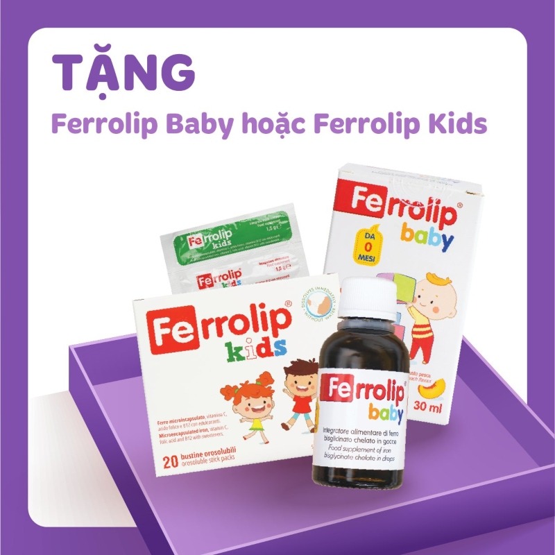 Ngoài ra, khi mua đủ 3 sản phẩm bất kì, ba mẹ sẽ nhận được thêm 1 sắt Ferrolip Baby hoặc Ferrolip Kids để giúp bổ sung sắt hiệu quả, hỗ trợ giảm nguy cơ thiếu sắt ở trẻ, đồng thời hương vị dễ uống giúp bé hợp tác hơn khi sử dụng hằng ngày.